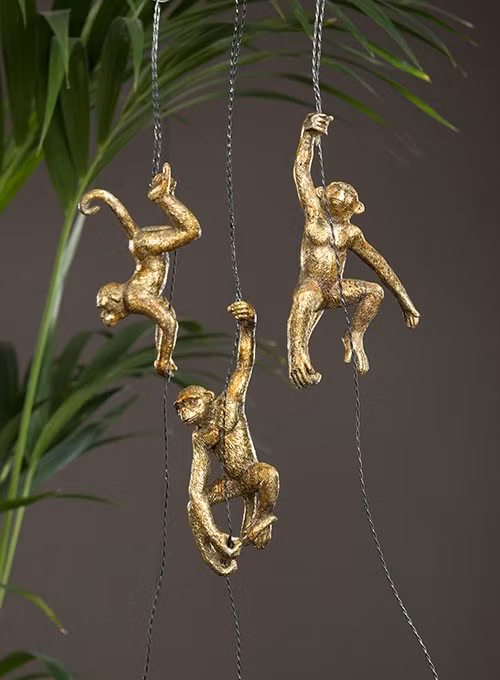 3 gulliga hängande apor i guld som du kan hänga vart du vill. Passar i fönstret, under en trapp, från taket, hängandes från stora växter för att ge lite extra liv i dem. Finns även i svart.